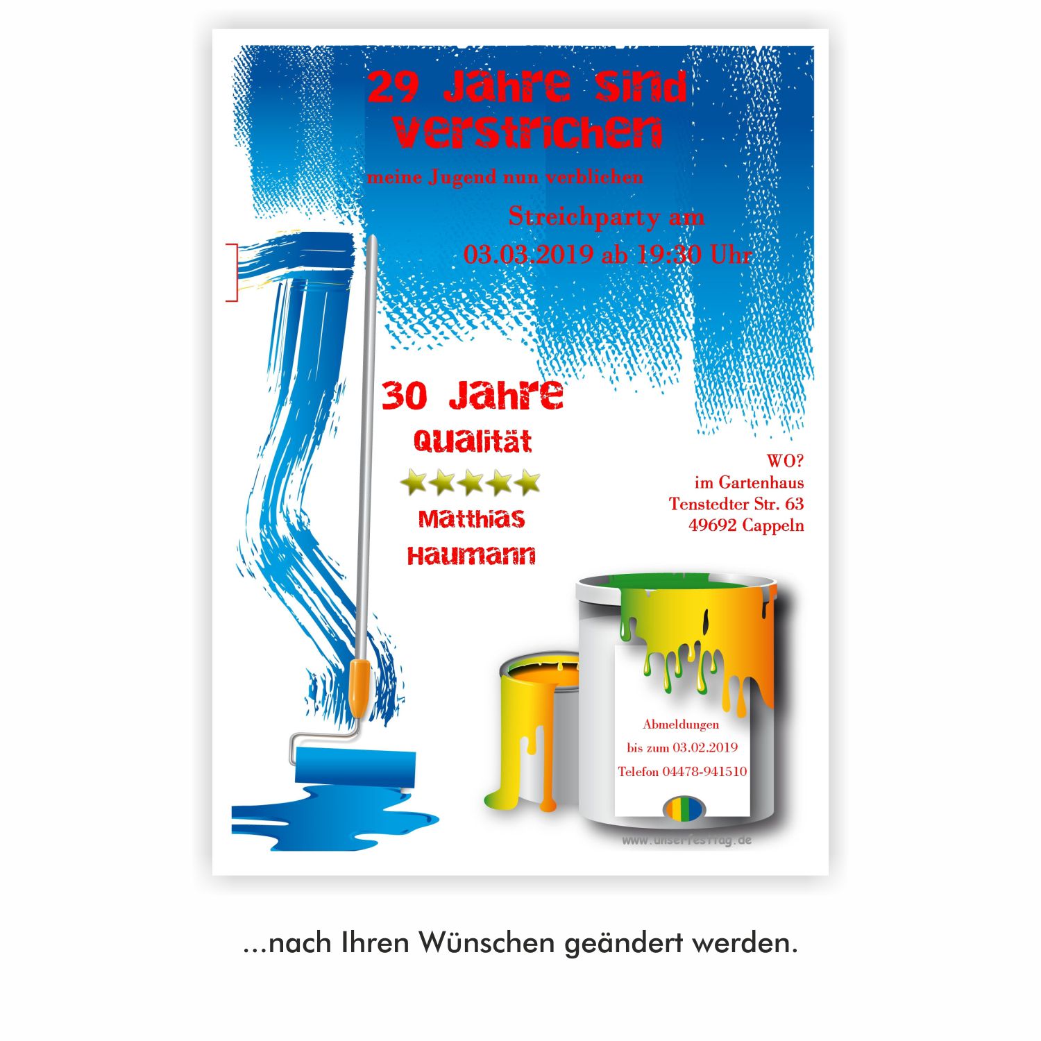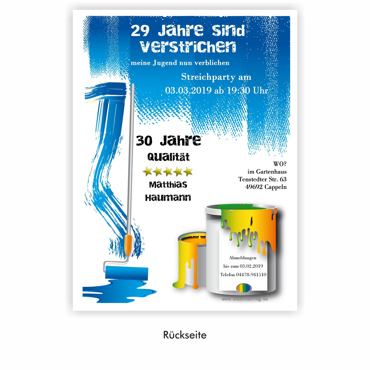 Maler – 30234 Musterbilder zum Vergrößern der Musterbilder einfach einmal auf das Bild klicken Hallo, leider gibt es Probleme mit diesem Formular. Bitte füllen Sie dieses Formular nur über den von uns zugesandten Link aus, da Sie es sonst nicht absenden können! Bei Fragen rufen Sie uns bitte an: 04478-941510 oder schreiben Sie uns eine Mail: Problem melden Vielen Dank für Ihr Verständnis Ihre Wunschdaten hier bitte eingeben Kartenfarbe blaugrünorangelila Vorderseite Alter Einladungstext, Datum, Uhrzeit und Ort der Feier. Alter verstrichen meine Streichparty Datum Wo im Straße Ort Abmeldung, Alter und Name des Gastgebers Abmeldung bis Tele Alter Qualität Name Name Benötigte Kundendaten Diese Angaben benötigen wir zum Zuordnen Ihrer Daten. Bitte füllen Sie alle Felder, soweit möglich, aus. Danke. Bestellnummer* Position Möchten Sie uns etwas mitteilen? Haben Sie spezielle Wünsche? Telefonnummer (nur für Rückfragen) Anrede FrauHerrFam. Vorname* Nachname* E-Mail* An diese Adresse senden wir Ihnen Ihre Muster/Korrekturen E-Mail eingeben E-Mail bestätigen This iframe contains the logic required to handle Ajax powered Gravity Forms.